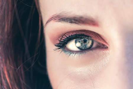 Eye close view. Human eye glance photo background. Emotional look