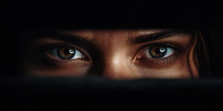 Young caucasian adult womans eyes peering through torn white paper, evoking mystery and curiosity.