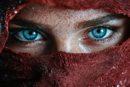 Mysterious blue eyes peering through red fabric