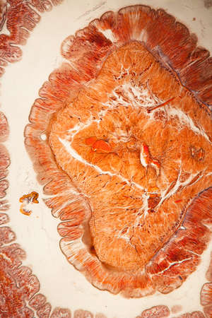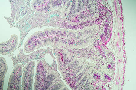 Tissue of Small intestine (Duodenum) and Vermiform appendix Human under the microscope in Lab.