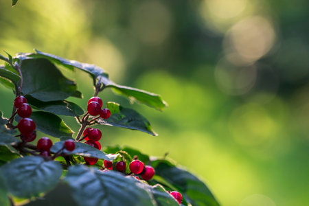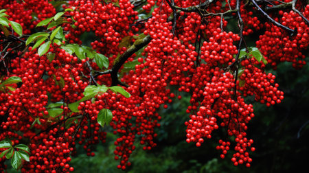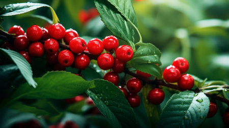 A captivating closeup of lush green leaves adorned with bright red berries, showcasing nature's beauty and the vibrant colors of the organic world.
