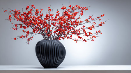 This artistic image features a sleek black vase filled with vibrant red berries, creating a striking focal point for modern interiors. Perfect for seasonal decoration!