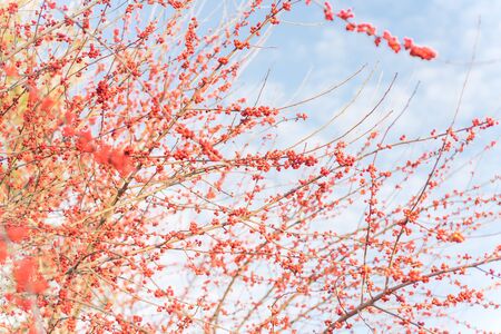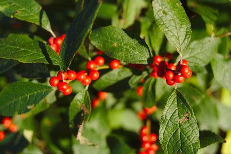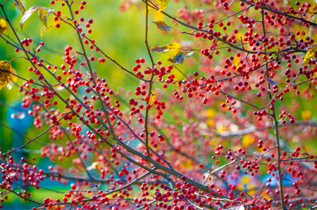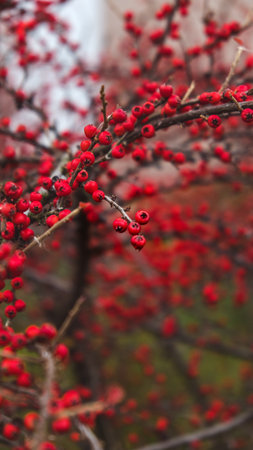 Bush with lots of red berries on branches, autumnal background. Close-up colorful autumn wild bushes with red berries and cold green leaves in the park. Shallow depth of field