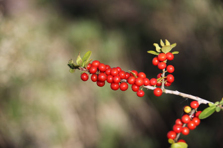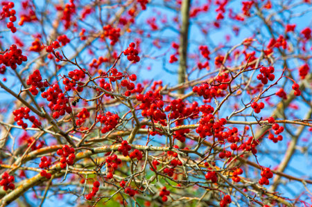 Red berries cluster on bare branches illuminated by soft sunlight creating a vibrant contrast in the winter landscape.