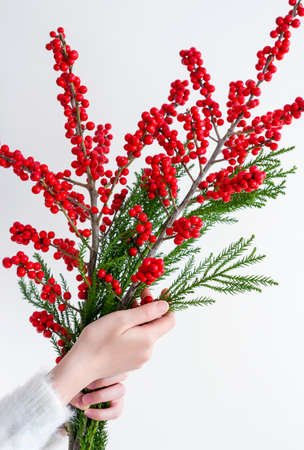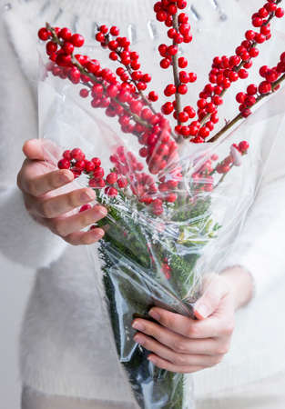 Woman hands holding red ilex verticillata or winterberry for christmas decoration