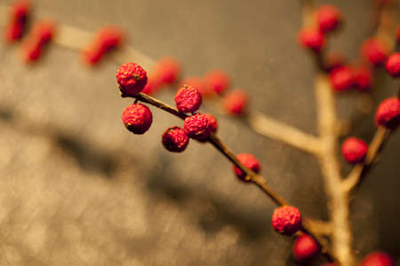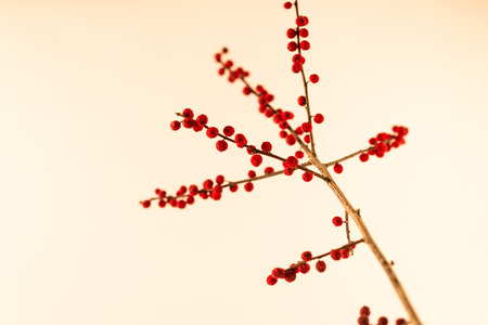 Winterberry branches on white old table.Vintage filters applied.