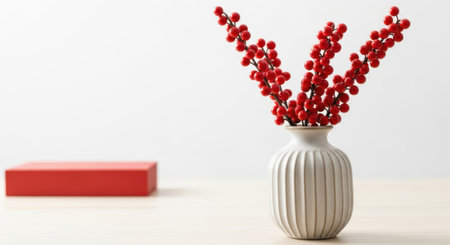 A beautiful still life composition featuring a white vase filled with vibrant red berries, a red box, all set against a clean white backdrop.