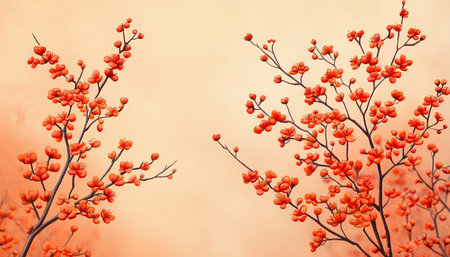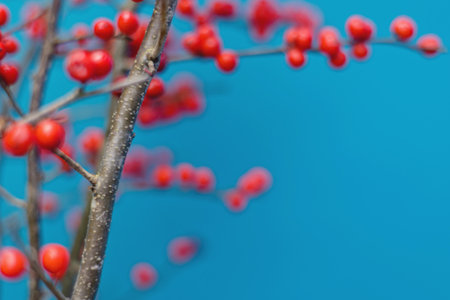 A closeup view of bright red berries growing on a bare branch against a soft blurred background creating a serene autumn atmosphere.