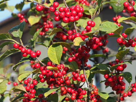 Red winterberry blossom near backyard fence. Ilex Decidua or winter berry, Possum Haw, Deciduous Holly red fruits on large shrub small tree no leaves dormant. Blaze of color in the fall in Dallas, Texas