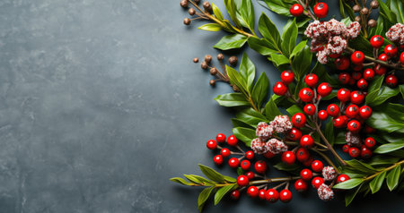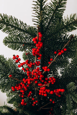 A close up view of a holiday decoration shows fresh green branches with clusters of bright red berries. This arrangement adds a festive touch to winter celebrations bringing joy indoors.