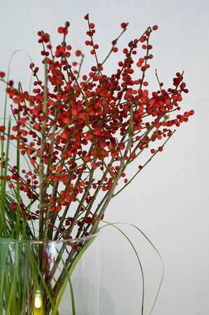 Red berries branch in glass vase in front of tan neutral beige wall background.