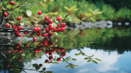 a mesmerizing photograph capturing the beauty of cranberries in wolding river korea and hancheongnam. the image showcases reflections and mirroring, with nature-inspired motifs in shades of light green and green. shot with a nikon f2 camera, this 32k uhd photo features an eye-catching composition that highlights the cranberries' vibrant colors. a stunning example of professional photography, available on unsplash. ai generated