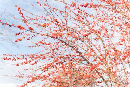 Selective focus of Ilex Decidua or winter berry, Possum Haw, Deciduous Holly red fruits on large shrub small tree, no leaves dormant. Blaze of color in the fall in Dallas, Texas. Crimson winterberry