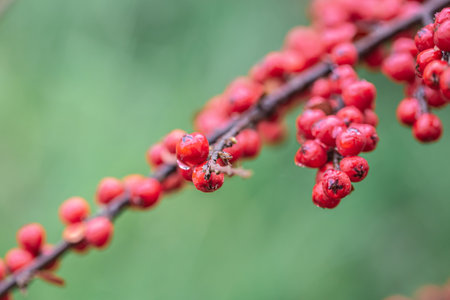 Close up Pyracantha bush berries of sunny day. Shallow depth of field.