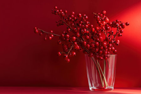 Vibrant red berries in a glass vase against a rich red background, capturing the essence of seasonal decor and modern style for festive settings