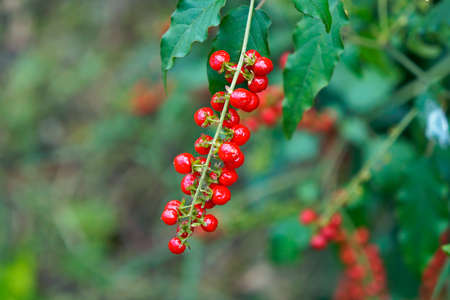 Wild red berries (Rivina humilis) on tropical rainforest