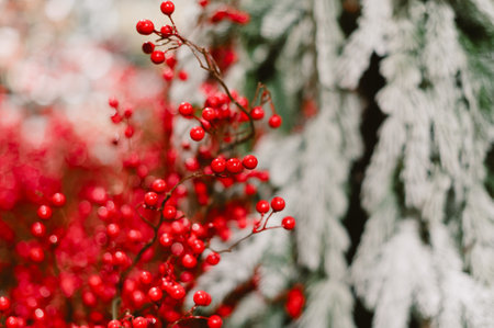 Bright red berries on holly branches create a joyful, festive atmosphere.