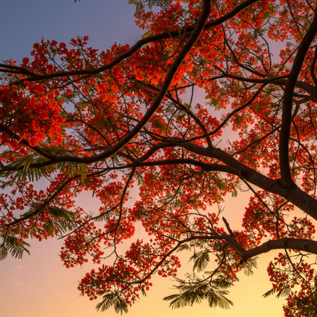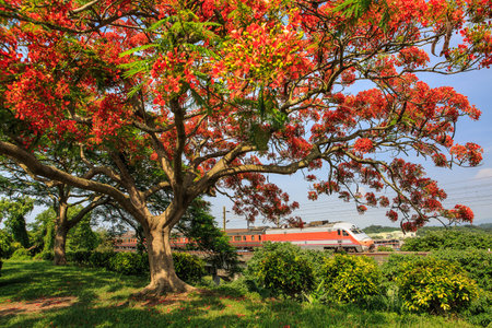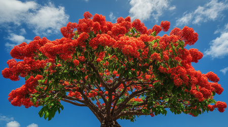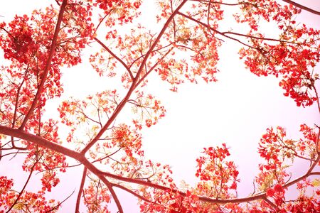 Amazing landscape in summertime at Ho chi Minh city, Vietnam, flamboyant tree with wonderful branch blooming red vibrant phoenix flower on blue sky background, typical for summer coming