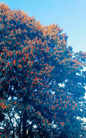 Very bright red, scarlet flowers Brachychiton Acerifolius, amazing flowering tree, against a blue sky, unusual bloom, very bright red, spain, denia, summer