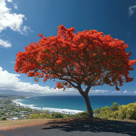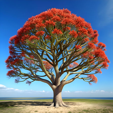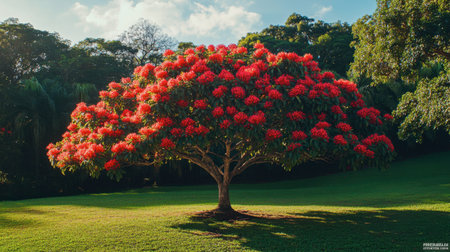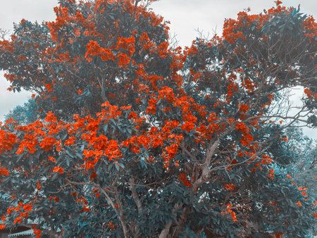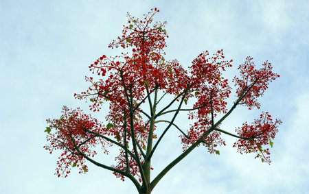 Picturesque Brachychiton acerifolia tree with bright red flowers and green leaves against the sky