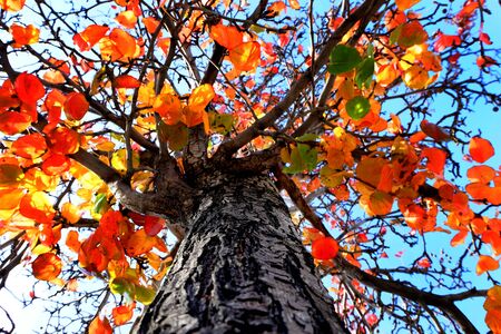 The Flame tree in winter, chilling air envelops, a few lingering leaves tremble, still atmosphere, clean.