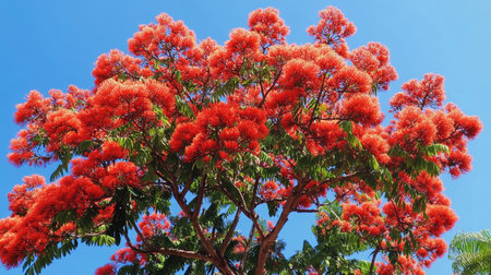 Delonix regia tree crown on bright summer day with clear blue sky on background and copy space. Summer background with blooming tree. Plant species name - Delonix regia (Hook.) Raf. Stock photo.