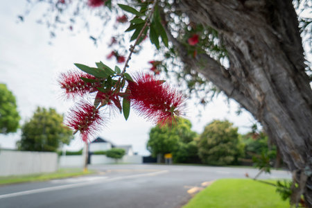 Red bottlebrush flowers (Callistemon) in full bloom. Auckland.
