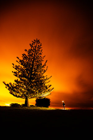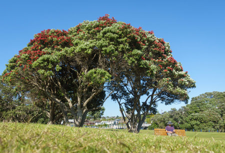 Pohutukawa trees in full bloom. Man sitting on the bench checking his phone. Milford Beach. Auckland.