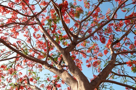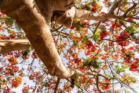 Summer colorful tree with red tropical flowers on blue sky background in Sharm El Sheikh, Egypt, Africa, close up. Red peacock flowers or the flame tree, royal poinciana on sky background