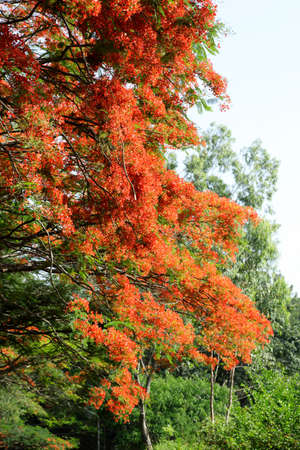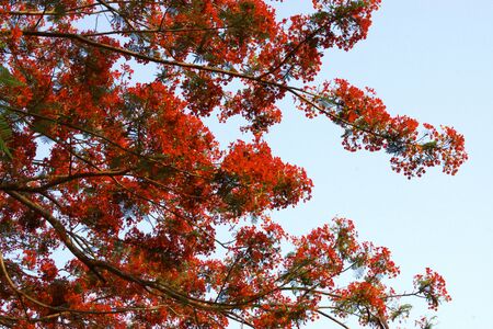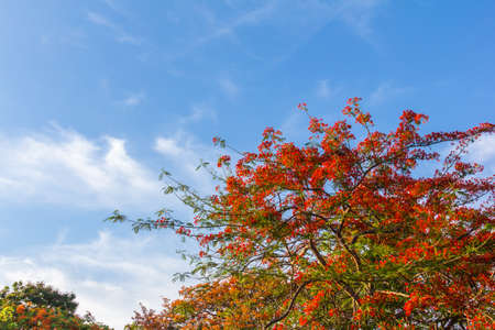 Beautiful Tropical red flowers Royal Poinciana or The Flame Tree (Delonix regia) in Thailand on blue sky the forest summer naturel background.