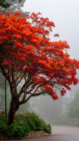 The Flame tree in light fog, dew on leaves, light soft diffused, threequarter view.