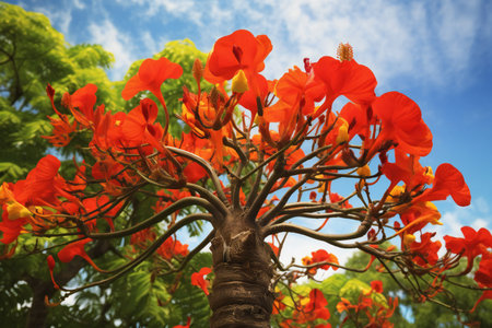 Royal poinciana, flame tree, flamboyant tree. Amazing red and yellow left tree in mexico. high quality photo