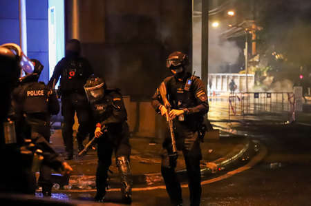 Bangkok, THAILAND - August 13, 2021: Riot police shoot tear gas and rubber bullets crackdown after protesters try to pass barrier to 1st Infantry Regiment for protest about failed covid-19 management.