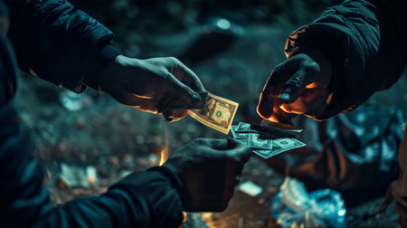 A close-up of hands exchanging stolen goods and money in a dark, secluded area