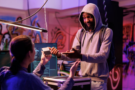 African american hacker in hood bringing ssd with illegal spyware to crime partner. Criminal holding hard drive with malicious software to break into server and breach data