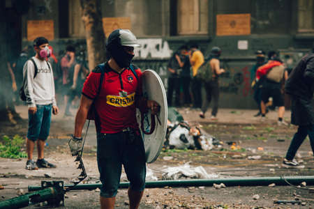 SANTIAGO, CHILE-NOVEMBER 8, 2019 - Protester protect themselves from riot police with improvised shields during the protests against the government of Pinera, for the social crisis in the country