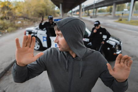 hooded offender with raised hands looking away with blurred multicultural police officers on background on urban street