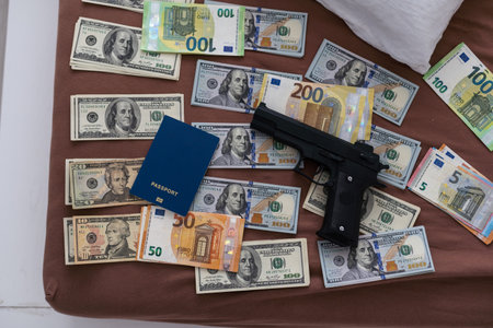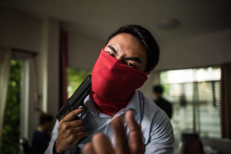 Robbery with gun's. Gun and money in a hands. Bank robbery, Man carrying a gun to rob the bank note. To threaten with the man. A murderer attacking holding gun kidnapping business young person.