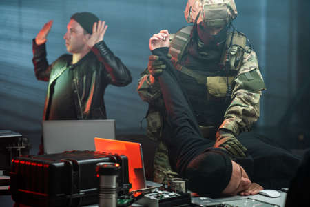 high angle view of multicultural police officers with pistols aiming at surrendered offender on blurred background outdoors