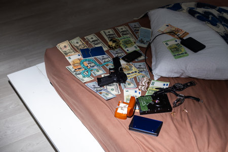 Drugs packet and money banknotes found in pocket during a police search with hand in black glove