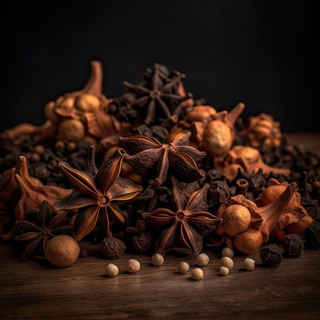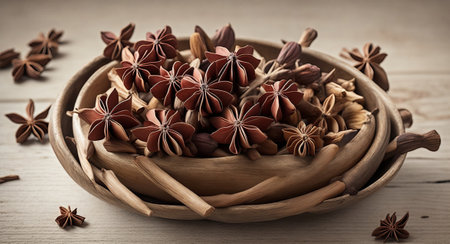 Close view of aromatic star anise, Highresolution image showing star anise seeds and pods, Closeup shot highlighting intricate surface and fragrant qualities of star anise