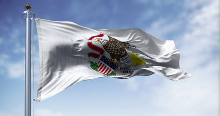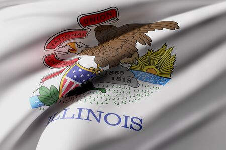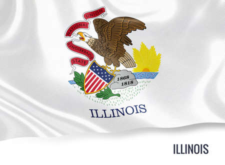 Illinois state flag waving in the wind. White field with Illinois seal, eagle on rock. 3d illustration render. Fluttering fabric. US state flag