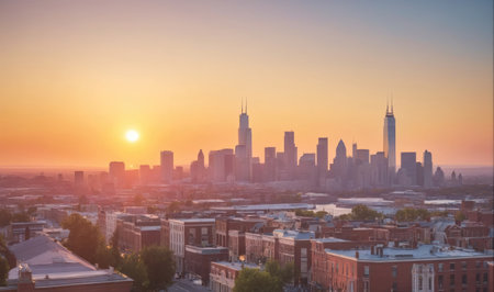 The sun sets over the Chicago skyline, casting a warm glow on the city