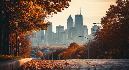 Autumn cityscape with trees and skyscrapers in the background