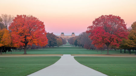 A winding gravel path cuts through a forest of trees displaying bright autumn colors. The vibrant foliage creates a picturesque scene under the clear sky, inviting exploration.