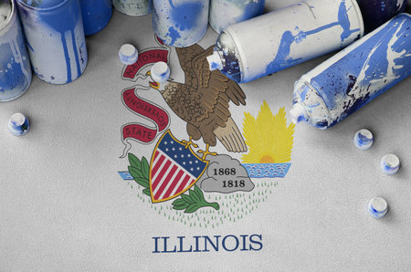 Illinois US state flag and few used aerosol spray cans for graffiti painting. Street art culture concept, vandalism problems