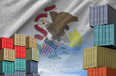 Illinois US state flag and big stack of shipping cargo containers in docks with sky background close up