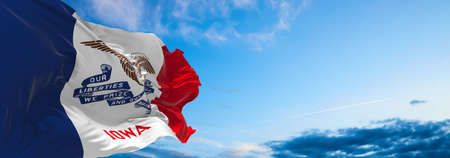 flag of Iowa at cloudy sky background on sunset. Patriotic concept about state. 3d illustration,