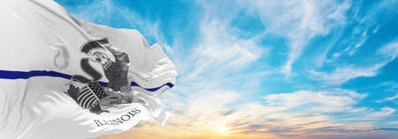 Close-up of the Illinois state flag waving in the wind on a clear day. Seal of Illinois against a white backdrop with the word Illinois below. 3d illustration render. Rippling fabric