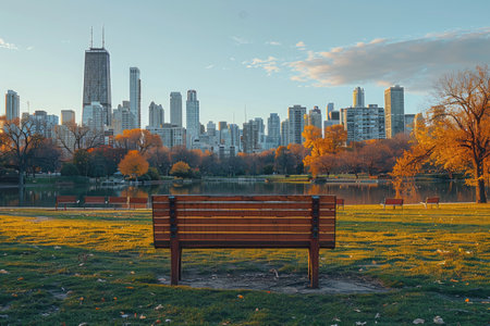 Lush city park with park benches and city skyline bicycles as background professional photography